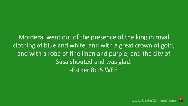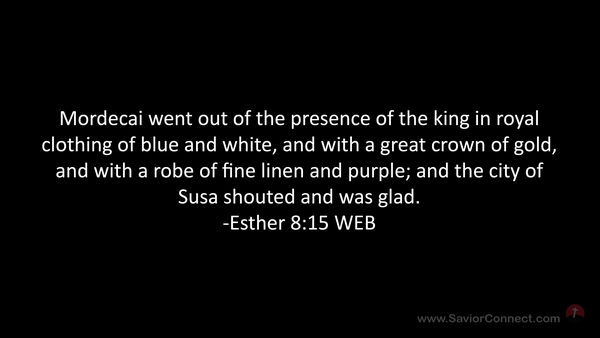 Mordecai went out of the presence of the king in royal clothing of blue and white, and with a great crown of gold, and with a robe of fine linen and purple; and the city of Susa shouted and was glad. -Esther 8:15 WEB