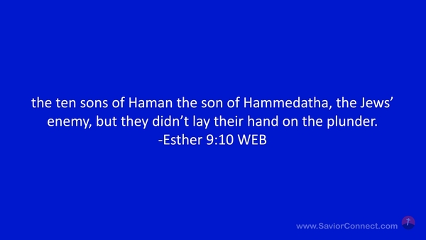 the ten sons of Haman the son of Hammedatha, the Jews’ enemy, but they didn’t lay their hand on the plunder. -Esther 9:10 WEB