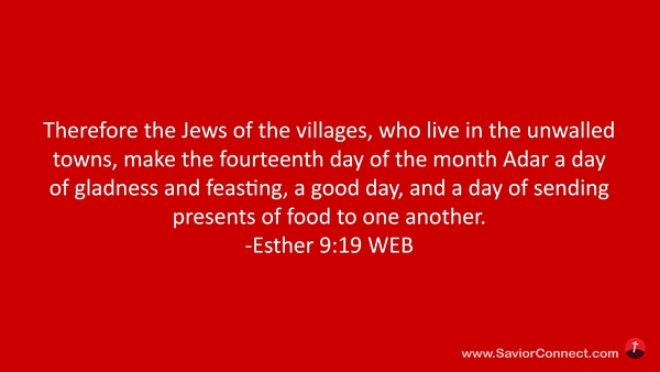 Therefore the Jews of the villages, who live in the unwalled towns, make the fourteenth day of the month Adar a day of gladness and feasting, a good day, and a day of sending presents of food to one another. -Esther 9:19 WEB