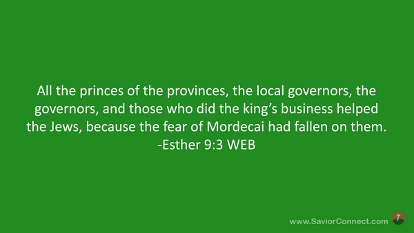 All the princes of the provinces, the local governors, the governors, and those who did the king’s business helped the Jews, because the fear of Mordecai had fallen on them. -Esther 9:3 WEB
