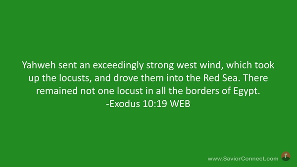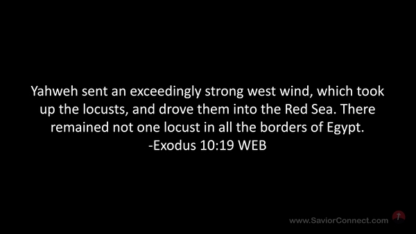 Yahweh sent an exceedingly strong west wind, which took up the locusts, and drove them into the Red Sea. There remained not one locust in all the borders of Egypt. -Exodus 10:19 WEB