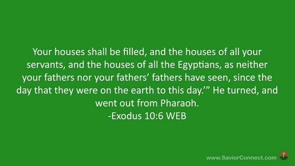 Your houses shall be filled, and the houses of all your servants, and the houses of all the Egyptians, as neither your fathers nor your fathers’ fathers have seen, since the day that they were on the earth to this day.’” He turned, and went out from Pharaoh. -Exodus 10:6 WEB