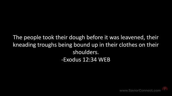 The people took their dough before it was leavened, their kneading troughs being bound up in their clothes on their shoulders. -Exodus 12:34 WEB
