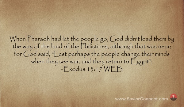 When Pharaoh had let the people go, God didn’t lead them by the way of the land of the Philistines, although that was near; for God said, “Lest perhaps the people change their minds when they see war, and they return to Egypt”; -Exodus 13:17 WEB
