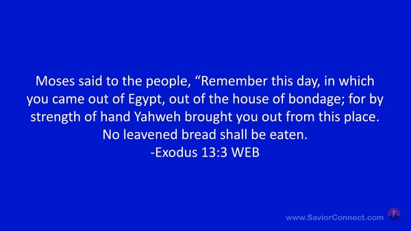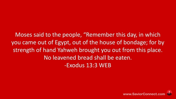 Moses said to the people, “Remember this day, in which you came out of Egypt, out of the house of bondage; for by strength of hand Yahweh brought you out from this place. No leavened bread shall be eaten. -Exodus 13:3 WEB