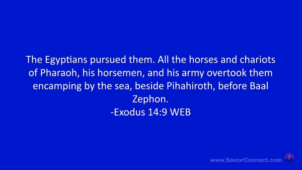 The Egyptians pursued them. All the horses and chariots of Pharaoh, his horsemen, and his army overtook them encamping by the sea, beside Pihahiroth, before Baal Zephon. -Exodus 14:9 WEB