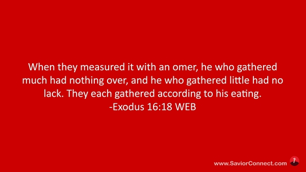 When they measured it with an omer, he who gathered much had nothing over, and he who gathered little had no lack. They each gathered according to his eating. -Exodus 16:18 WEB