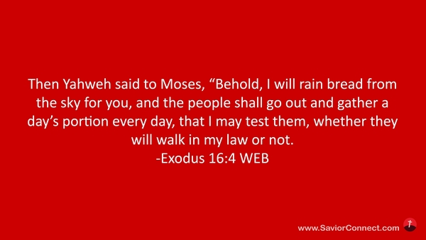 Then Yahweh said to Moses, “Behold, I will rain bread from the sky for you, and the people shall go out and gather a day’s portion every day, that I may test them, whether they will walk in my law or not. -Exodus 16:4 WEB