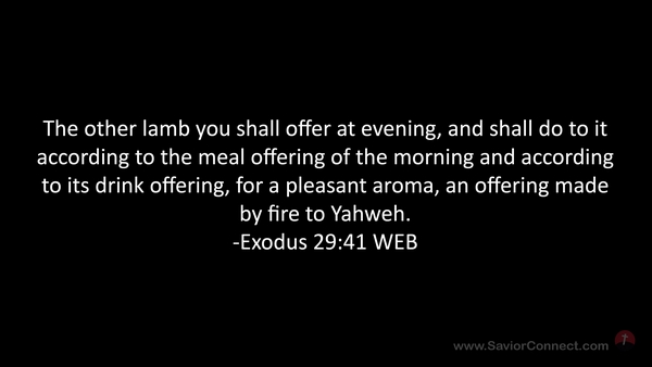 The other lamb you shall offer at evening, and shall do to it according to the meal offering of the morning and according to its drink offering, for a pleasant aroma, an offering made by fire to Yahweh. -Exodus 29:41 WEB