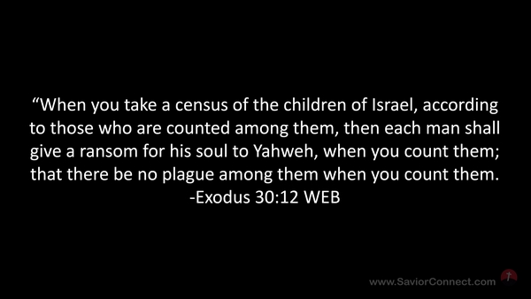 “When you take a census of the children of Israel, according to those who are counted among them, then each man shall give a ransom for his soul to Yahweh, when you count them; that there be no plague among them when you count them. -Exodus 30:12 WEB