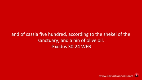 and of cassia five hundred, according to the shekel of the sanctuary; and a hin of olive oil. -Exodus 30:24 WEB