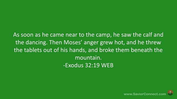 As soon as he came near to the camp, he saw the calf and the dancing. Then Moses’ anger grew hot, and he threw the tablets out of his hands, and broke them beneath the mountain. -Exodus 32:19 WEB