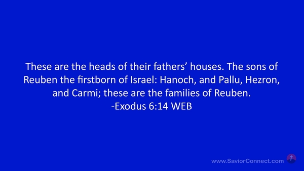 These are the heads of their fathers’ houses. The sons of Reuben the firstborn of Israel: Hanoch, and Pallu, Hezron, and Carmi; these are the families of Reuben. -Exodus 6:14 WEB