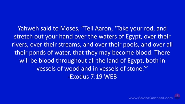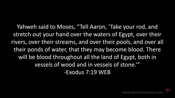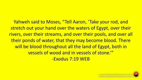 Yahweh said to Moses, “Tell Aaron, 'Take your rod, and stretch out your hand over the waters of Egypt, over their rivers, over their streams, and over their pools, and over all their ponds of water, that they may become blood. There will be blood throughout all the land of Egypt, both in vessels of wood and in vessels of stone.’” -Exodus 7:19 WEB