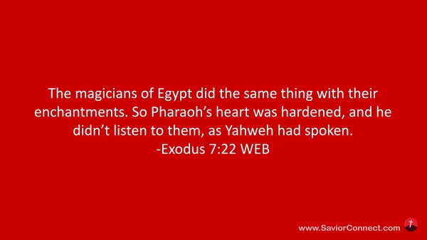 The magicians of Egypt did the same thing with their enchantments. So Pharaoh’s heart was hardened, and he didn’t listen to them, as Yahweh had spoken. -Exodus 7:22 WEB