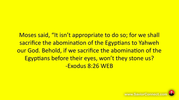 Moses said, “It isn’t appropriate to do so; for we shall sacrifice the abomination of the Egyptians to Yahweh our God. Behold, if we sacrifice the abomination of the Egyptians before their eyes, won’t they stone us? -Exodus 8:26 WEB