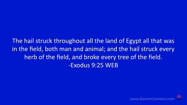 The hail struck throughout all the land of Egypt all that was in the field, both man and animal; and the hail struck every herb of the field, and broke every tree of the field. -Exodus 9:25 WEB