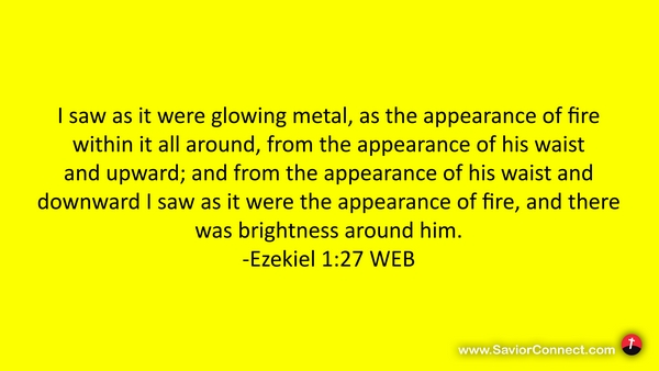 I saw as it were glowing metal, as the appearance of fire within it all around, from the appearance of his waist and upward; and from the appearance of his waist and downward I saw as it were the appearance of fire, and there was brightness around him. -Ezekiel 1:27 WEB