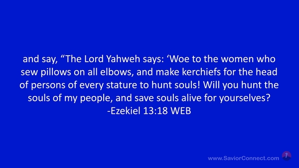 and say, “The Lord Yahweh says: 'Woe to the women who sew pillows on all elbows, and make kerchiefs for the head of persons of every stature to hunt souls! Will you hunt the souls of my people, and save souls alive for yourselves? -Ezekiel 13:18 WEB