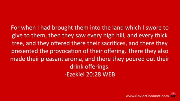 For when I had brought them into the land which I swore to give to them, then they saw every high hill, and every thick tree, and they offered there their sacrifices, and there they presented the provocation of their offering. There they also made their pleasant aroma, and there they poured out their drink offerings. -Ezekiel 20:28 WEB