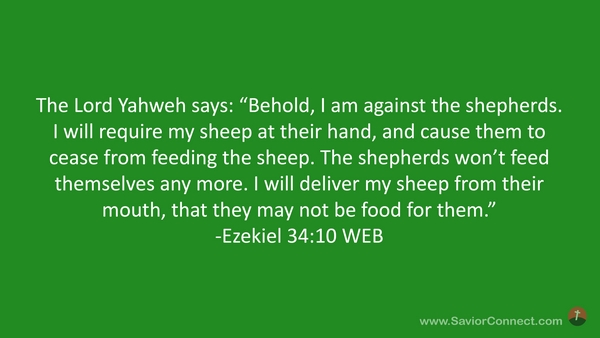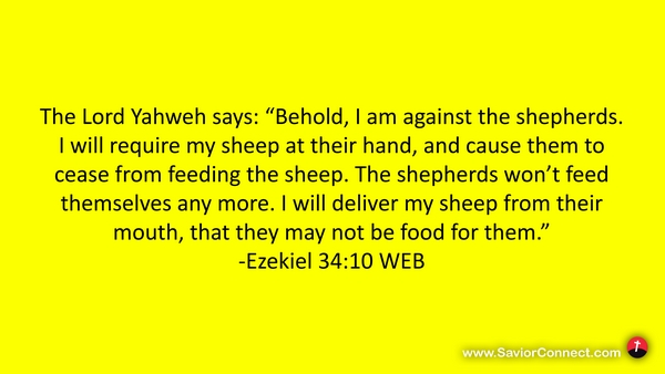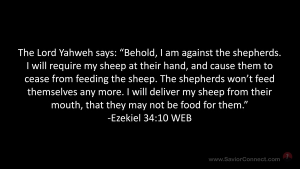 The Lord Yahweh says: “Behold, I am against the shepherds. I will require my sheep at their hand, and cause them to cease from feeding the sheep. The shepherds won’t feed themselves any more. I will deliver my sheep from their mouth, that they may not be food for them.” -Ezekiel 34:10 WEB