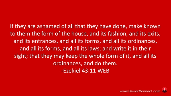 If they are ashamed of all that they have done, make known to them the form of the house, and its fashion, and its exits, and its entrances, and all its forms, and all its ordinances, and all its forms, and all its laws; and write it in their sight; that they may keep the whole form of it, and all its ordinances, and do them. -Ezekiel 43:11 WEB