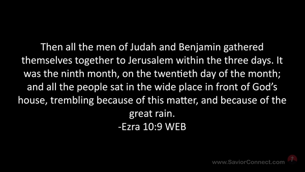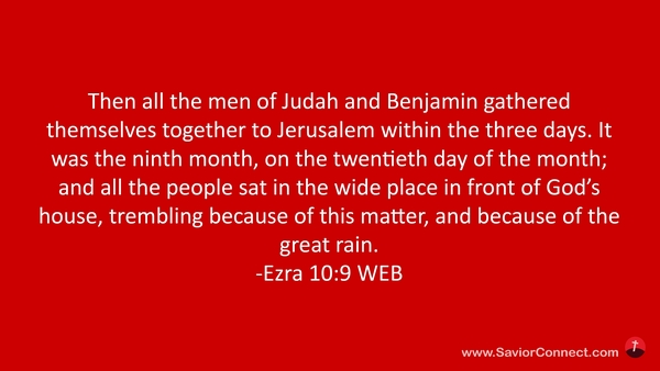 Then all the men of Judah and Benjamin gathered themselves together to Jerusalem within the three days. It was the ninth month, on the twentieth day of the month; and all the people sat in the wide place in front of God’s house, trembling because of this matter, and because of the great rain. -Ezra 10:9 WEB