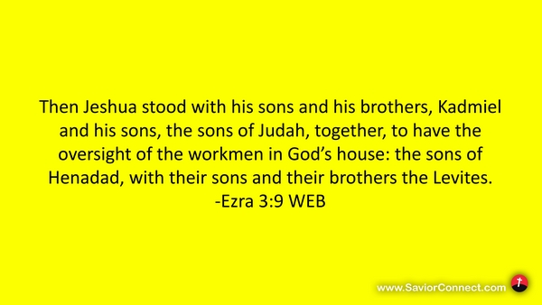 Then Jeshua stood with his sons and his brothers, Kadmiel and his sons, the sons of Judah, together, to have the oversight of the workmen in God’s house: the sons of Henadad, with their sons and their brothers the Levites. -Ezra 3:9 WEB
