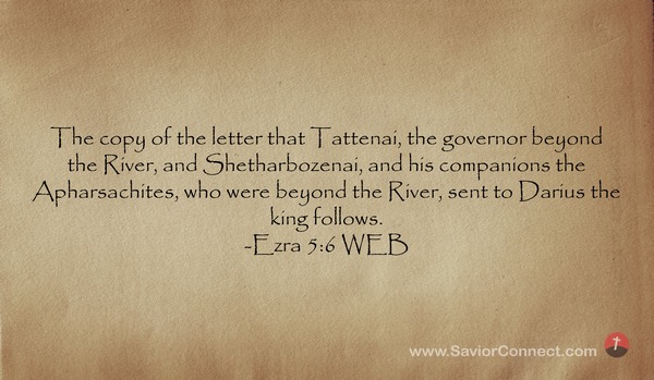 The copy of the letter that Tattenai, the governor beyond the River, and Shetharbozenai, and his companions the Apharsachites, who were beyond the River, sent to Darius the king follows. -Ezra 5:6 WEB