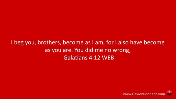 I beg you, brothers, become as I am, for I also have become as you are. You did me no wrong, -Galatians 4:12 WEB