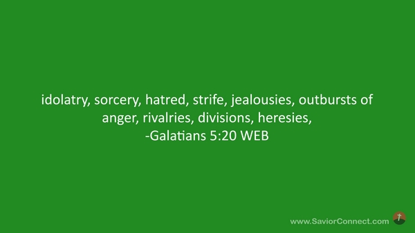 idolatry, sorcery, hatred, strife, jealousies, outbursts of anger, rivalries, divisions, heresies, -Galatians 5:20 WEB