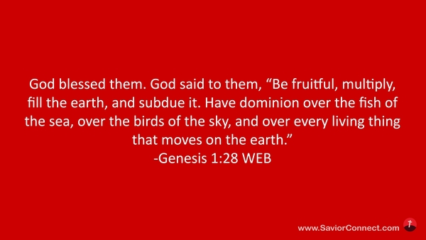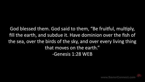 God blessed them. God said to them, “Be fruitful, multiply, fill the earth, and subdue it. Have dominion over the fish of the sea, over the birds of the sky, and over every living thing that moves on the earth.” -Genesis 1:28 WEB