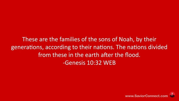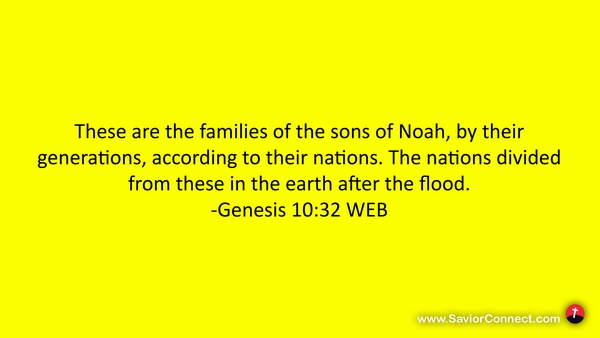 These are the families of the sons of Noah, by their generations, according to their nations. The nations divided from these in the earth after the flood. -Genesis 10:32 WEB