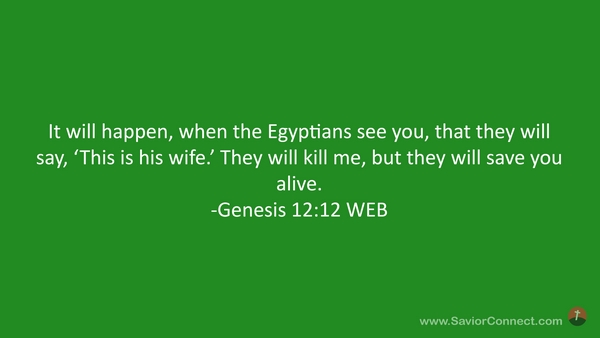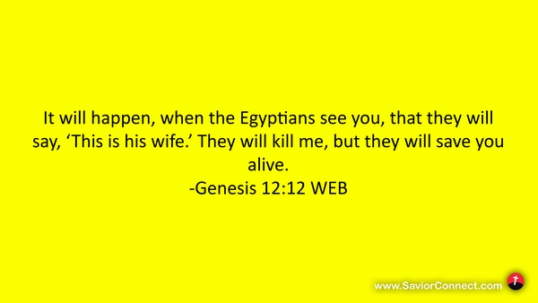 It will happen, when the Egyptians see you, that they will say, 'This is his wife.’ They will kill me, but they will save you alive. -Genesis 12:12 WEB