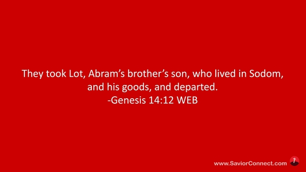 They took Lot, Abram’s brother’s son, who lived in Sodom, and his goods, and departed. -Genesis 14:12 WEB