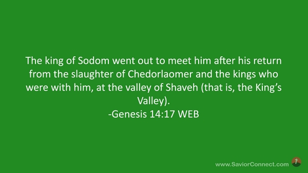 The king of Sodom went out to meet him after his return from the slaughter of Chedorlaomer and the kings who were with him, at the valley of Shaveh (that is, the King’s Valley). -Genesis 14:17 WEB