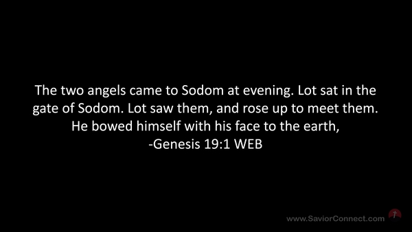 The two angels came to Sodom at evening. Lot sat in the gate of Sodom. Lot saw them, and rose up to meet them. He bowed himself with his face to the earth, -Genesis 19:1 WEB