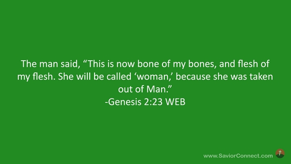 The man said, “This is now bone of my bones, and flesh of my flesh. She will be called 'woman,’ because she was taken out of Man.” -Genesis 2:23 WEB