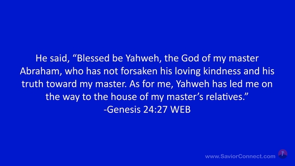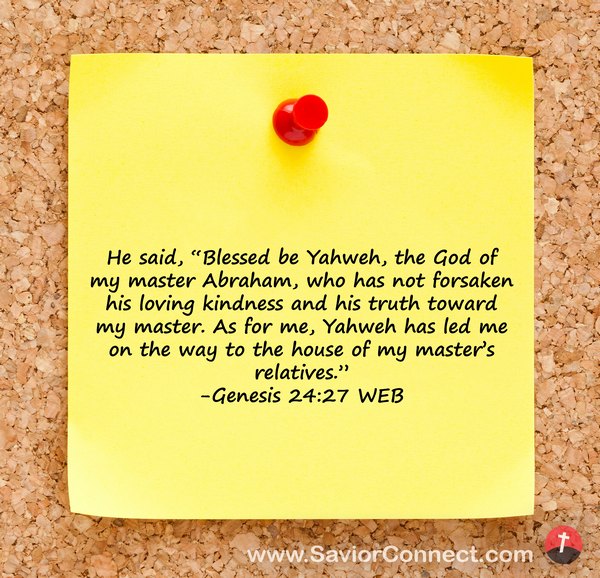 He said, “Blessed be Yahweh, the God of my master Abraham, who has not forsaken his loving kindness and his truth toward my master. As for me, Yahweh has led me on the way to the house of my master’s relatives.” -Genesis 24:27 WEB