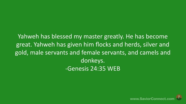 Yahweh has blessed my master greatly. He has become great. Yahweh has given him flocks and herds, silver and gold, male servants and female servants, and camels and donkeys. -Genesis 24:35 WEB