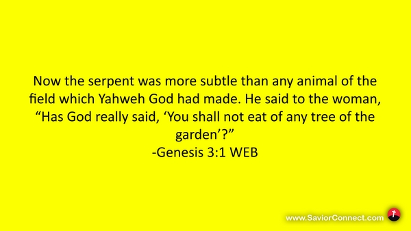 Now the serpent was more subtle than any animal of the field which Yahweh God had made. He said to the woman, “Has God really said, 'You shall not eat of any tree of the garden’?” -Genesis 3:1 WEB