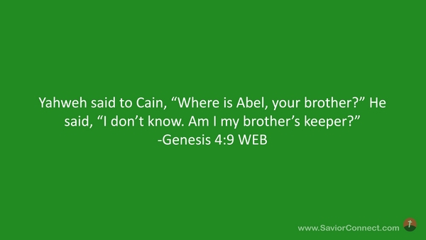 Yahweh said to Cain, “Where is Abel, your brother?” He said, “I don’t know. Am I my brother’s keeper?” -Genesis 4:9 WEB