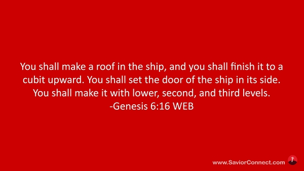 You shall make a roof in the ship, and you shall finish it to a cubit upward. You shall set the door of the ship in its side. You shall make it with lower, second, and third levels. -Genesis 6:16 WEB