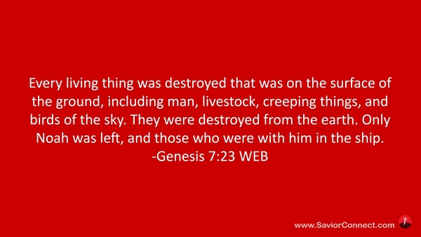 Every living thing was destroyed that was on the surface of the ground, including man, livestock, creeping things, and birds of the sky. They were destroyed from the earth. Only Noah was left, and those who were with him in the ship. -Genesis 7:23 WEB