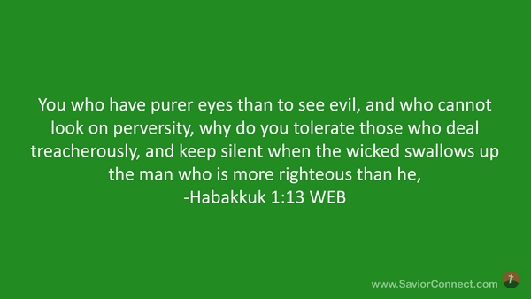 You who have purer eyes than to see evil, and who cannot look on perversity, why do you tolerate those who deal treacherously, and keep silent when the wicked swallows up the man who is more righteous than he, -Habakkuk 1:13 WEB