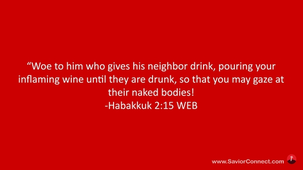 “Woe to him who gives his neighbor drink, pouring your inflaming wine until they are drunk, so that you may gaze at their naked bodies! -Habakkuk 2:15 WEB
