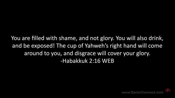 You are filled with shame, and not glory. You will also drink, and be exposed! The cup of Yahweh’s right hand will come around to you, and disgrace will cover your glory. -Habakkuk 2:16 WEB