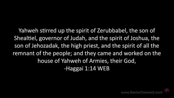 Yahweh stirred up the spirit of Zerubbabel, the son of Shealtiel, governor of Judah, and the spirit of Joshua, the son of Jehozadak, the high priest, and the spirit of all the remnant of the people; and they came and worked on the house of Yahweh of Armies, their God, -Haggai 1:14 WEB