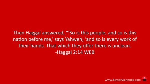 Then Haggai answered, “'So is this people, and so is this nation before me,’ says Yahweh; 'and so is every work of their hands. That which they offer there is unclean. -Haggai 2:14 WEB