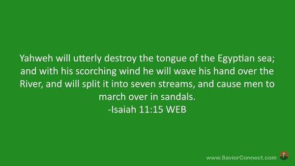 Yahweh will utterly destroy the tongue of the Egyptian sea; and with his scorching wind he will wave his hand over the River, and will split it into seven streams, and cause men to march over in sandals. -Isaiah 11:15 WEB